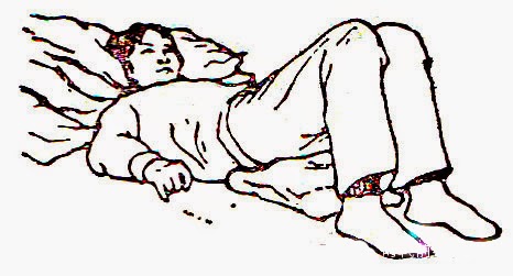 严重腰椎间盘突出症的患者,做完俯卧沉腰法和仰卧沉腰法以后,请别人帮助,再做一次“斜版”使椎体旋转,更有助于突出的髓核回纳到椎间盘内。